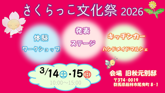 さくらっこ文化祭2026 3/14㊏・15㊐ 2026 1/04 お知らせ 2026年1月4日 『さくらっこ文化祭2026』子どもから大人まで、皆さんに楽しんで頂けるイベントです。ぜひお出掛けください。 旧秋元邸は、向井千秋記念子ども科学館の東並びにあります。 お知らせ 関連記事関連する記事はまだ見つかりませんでした。